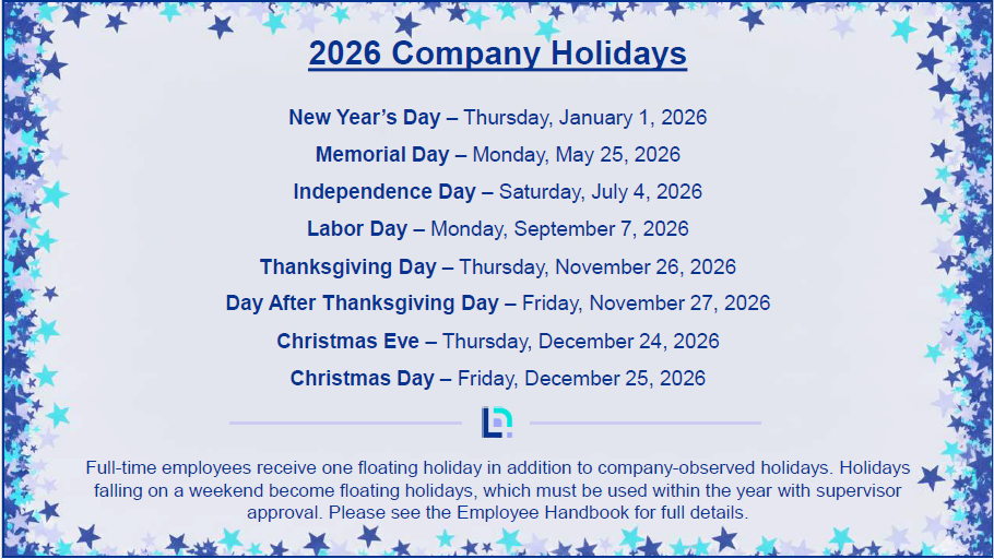 2026 Company Holidays January 28, 2026 18:43 Updated Related to Paid Time Off Holiday 2026 Company Holidays .png 300 KB Download Related articles 2026 Benefits Guide Employee Resources Guide 2025 Employee FAQs: Paid Time Off Office 365 Training Center Pamphlet Employee FAQs: Floating Holidays and Paid Holidays